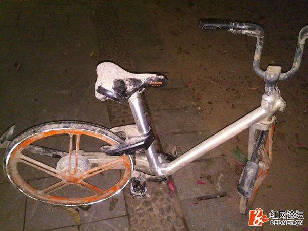 座垫不翼而飞,成了残废车。车前面还挂着一把车锁。