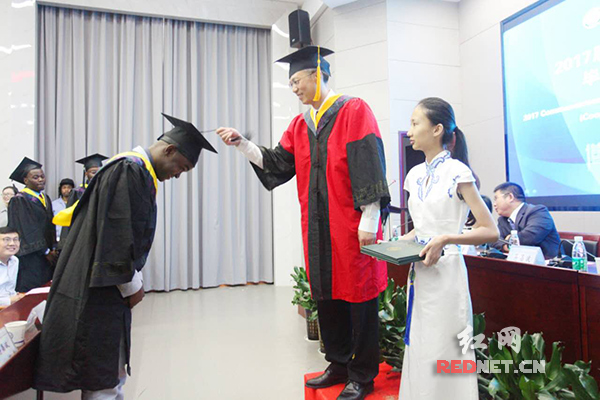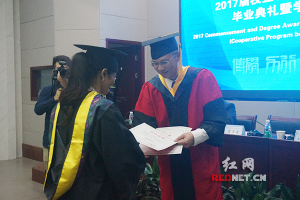 长沙理工大学副校长蒋昌波为留学生颁发学位证书并拨穗。