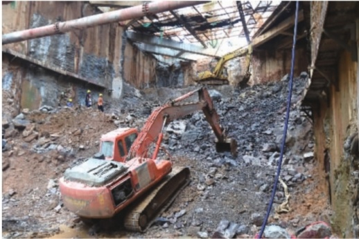 9日下午,长沙地铁4号线湖南大学站,几台挖土机在清理爆破后的碎石。记者田超 摄