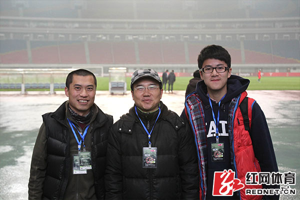 2012年2月,友谊赛中国队VS科威特队在长沙贺龙体育中心举行。彭鸣皋(右一)和其他足球记者在现场采访。