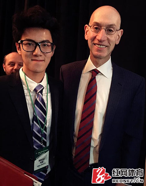 彭鸣皋(前排左)与NBA总裁亚当·萧华合影。
