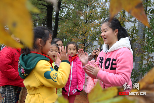 南华大学医学院爱心支教志愿者与湖南省衡阳县樟树乡中心小学的同学们在玩游戏。