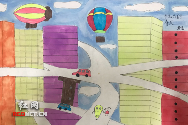 “十九大为我们描绘了美好生活蓝图,看!未来的城市,马路在天上,交通便利,好开心!”(衡阳技师学院 周佳)