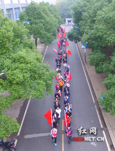 志愿者们在南华大学校园里进行环校跑,宣传。