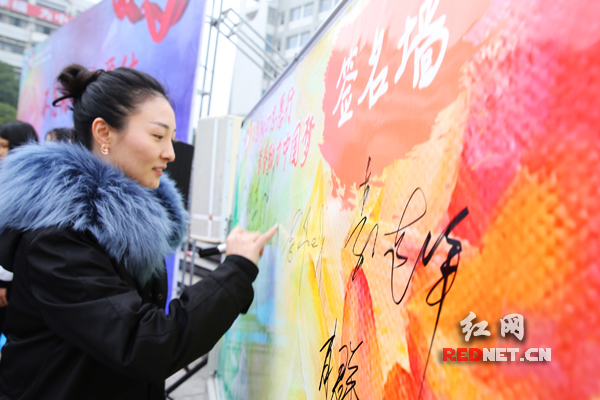 志愿者在“不忘初心志愿行,青春助力中国梦”签名版上签名。