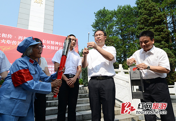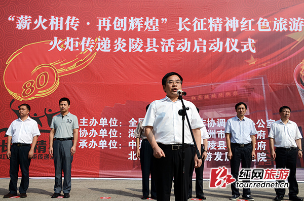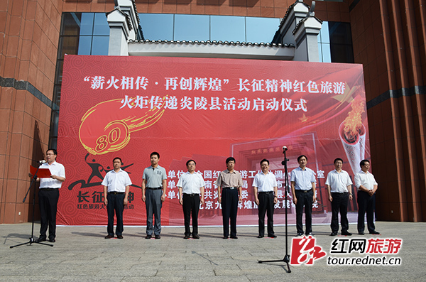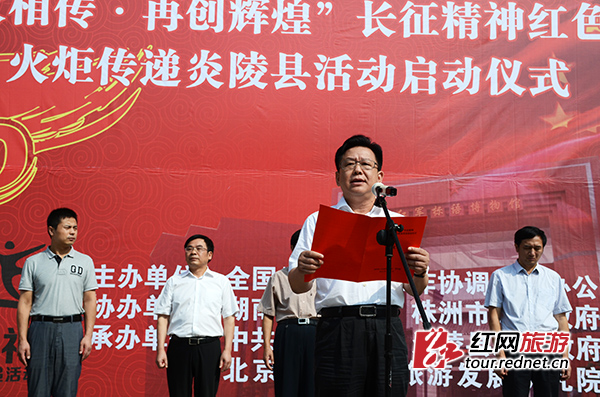 湖南省旅游局巡视员刘绵松出席活动并宣布活动启动,株洲市政府副市长谭可敏,炎陵县委书记黄诗燕,湖南省旅游局办公室主任欧阳斌,全国长征精神红色旅游火炬传递活动组委会副秘书长董李等领导出席活动。