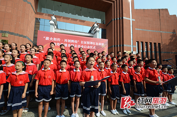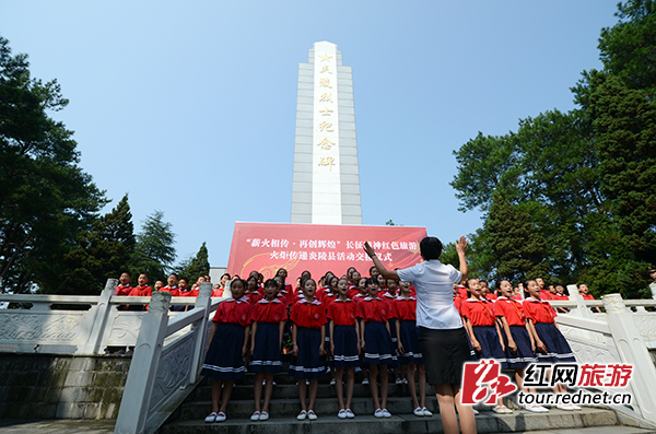 (炎陵烈士陵园里举行了“缅怀革命先烈,祭奠红军将士”纪念活动,少先队员唱红歌。)