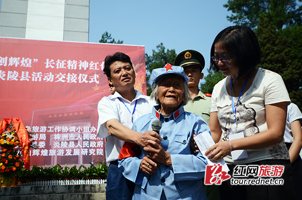 (炎陵县委副书记、副县长文专文从老红军手中接过火种保存。)