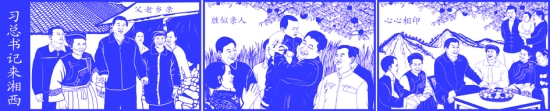 刚刚完成的作品摆放在李铁骑工作室的正中央,以蓝色为主色,长约3米,宽约70厘米,画面线条丰富,人物栩栩如生。整幅作品由3个画面组成:第一个画面取名“父老乡亲”,习总书记左手拉着苗家大叔,右手拉着身穿苗服的大妈,亲切之情扑面而来;第二个画面取名“胜似亲人”,习总书记怀抱小孩,侧着身子与村民们笑谈,一村民不由自主地拍起了双手;第三个画面取名“心心相印”,习总书记与村民们围坐一堂,言笑晏晏与村民们交谈,村民们的脸上满是轻松和笑容。