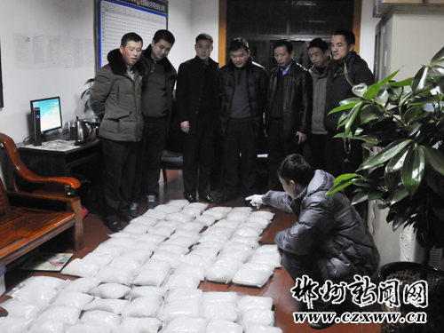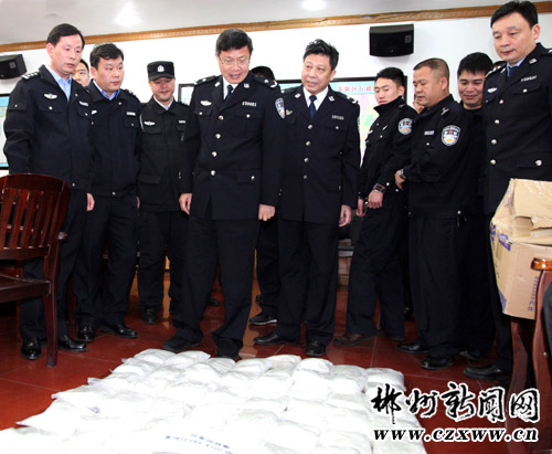 郴州市副市长、市公安局党委书记、局长王周(左四)查看缴获的100余公斤毒品