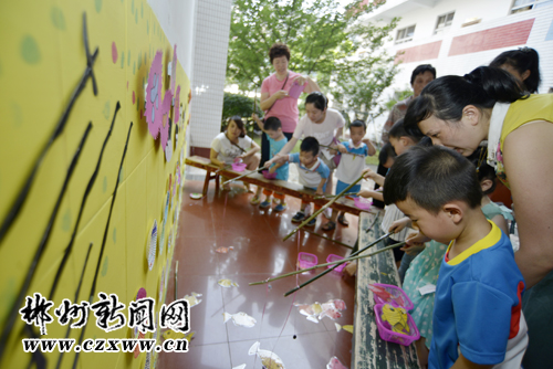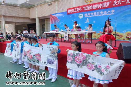 5月29日,郴州市五完小举办“红领巾相约中国梦”庆六一文艺汇演。孩子们在展示自己的书画作品。