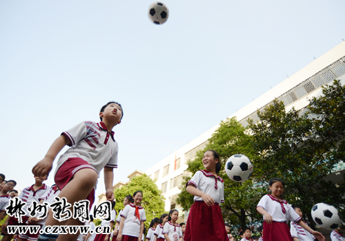 红网郴州站6月1日讯 5月29日,市三完小的孩子们在教练的带领下练习足球技巧,当日,市三完小联合北湖区足协开展“足球进校园,健康迎六一”活动。