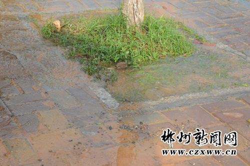 记者赶到现场看到,在该站台的路面上有一大块积水,市民上下车都得“绕道而行”。沿着水流方向,记者发现水流从地面砖块下6、7个“泉眼”里不断冒出,引来不少市民关注。