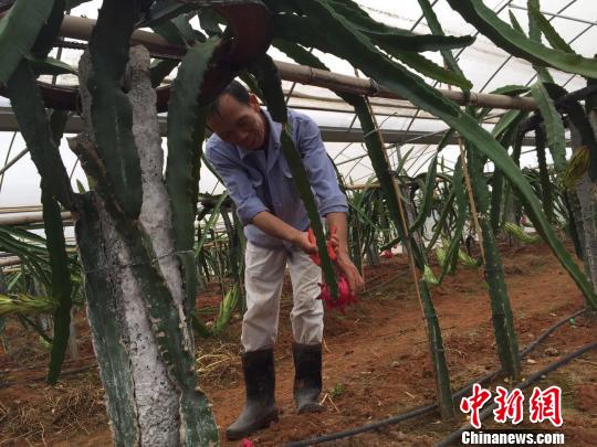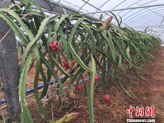 中新网9月1日讯(中新网记者 鲁毅 通讯员 许群飞 侯小芳)火龙果原本适合在热带地区生长,湘籍商人却通过向台湾果园取经,成功让台湾的火龙果品种在家乡永兴县开花结果。8月30日,记者来到该县高亭镇窝黄村火龙果栽植基地,看到了成片正在挂果的火龙果。