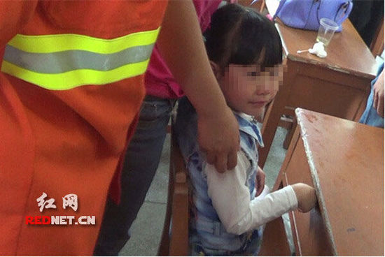 了解现场情况后,指挥员喻江波决定利用切割机对课桌进行破拆,在课桌其中一侧开了个“V”型小口,用钳子一点点分解课桌洞旁的木材,取出孩子的手指。救援过程中,为避免孩子再次受到伤害,施救人员对她的右手和面部做了适当的保护。二十分钟后,小学生的手指从“洞口”中安全地解救出来,除了手指有点擦伤和红肿外,并无大碍。