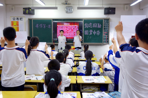 图为学校初二年级263班正在举行的“勿忘国耻圆梦中华”主题班会。