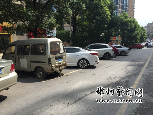 当天,郴州新闻网记者来到东风路延伸段看到,一辆车牌号为“湘L 24752”面包车停在路边,车身附有厚厚的灰尘,前挡风玻璃及车窗被贴有广告宣传单,左侧两个轮胎干瘪没有气,后保险杆脱落,车身破损严重、锈迹斑斑,车内放有一个塑料框。