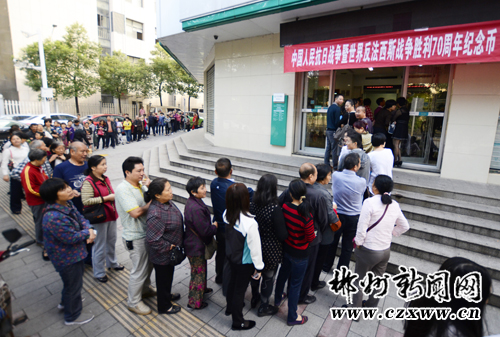 红网郴州站10月13日讯(记者 李涵溪)10月12日上午,中国人民银行发行的“中国人民抗日战争暨世界反法西斯战争胜利70周年”纪念币(镍包钢纪念币)开始公开兑换,郴州市各兑换点前来换币的人们纷纷排起长队。