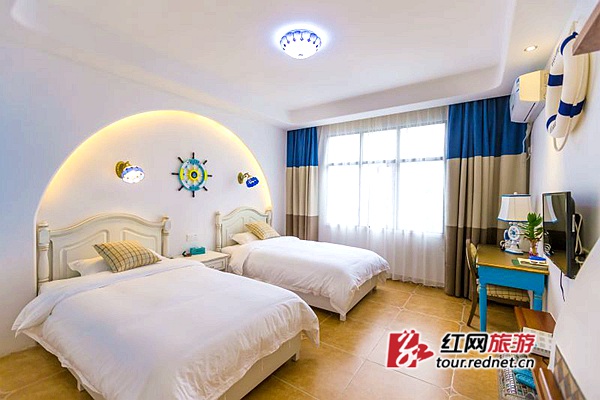 走进“转角1号”前厅,不大的空间却迷漫着一股小清新,别致的小书吧、小饰物、小盆景,给人一种如家似的温馨。步入不同楼层的房间,干净整洁,朴素不失典雅。窗帘、洗漱台、桌椅、台灯、吊灯等点缀的蓝色调加上墙面上嵌有船舵、救生圈等船舶装饰物让人感觉到仿佛置身于一艘航行在湛蓝大海上的远洋船。