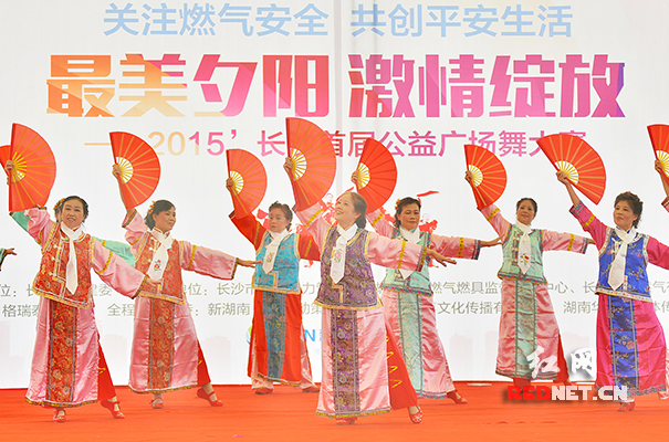 红网长沙10月22日讯(通讯员 李义 时刻新闻记者 黎鑫)昨日,由长沙市住建委主办的“最美夕阳激情绽放——2015长沙首届公益广场舞大赛”在风帆广场举行,十支参赛队伍激烈角逐,展示中老年人积极向上的生活态度。红飘带艺术团代表队最终以舞蹈《茶香中国》力压群雄获得冠军。