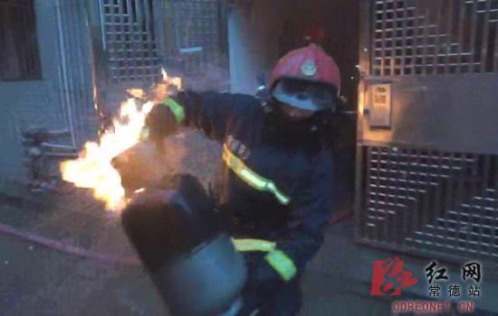 在开花水枪的掩护下,安乡中队中队长胡俊佩戴好阻燃头套、手套等个人防护装备,抓起一米高火焰的液化气罐就往室外跑。16时42分,消防官兵成功将着火液化气钢瓶移至安全区域,并用开花水枪对钢瓶继续进行冷却。16时50分液化气燃烧殆尽,险情解除。