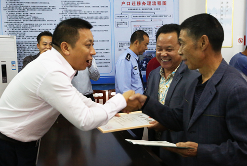 红网郴州站11月4日讯 近年来,资兴市积极实施生态资源权利置换和户籍改革试点工作,该市七里镇湘源村34户65位村民,通过权利置换,“零门槛”转户为城镇居民户口,到城区集中建房居住,又通过成立土地股份合作社集中经营的形式,仍保留了农村户口的部分权益,成为“拥有土地的城市居民”。图为10月29日,在转户交接仪式上,村民接过“居民户口簿”和“土地股份合作社营业执照”。