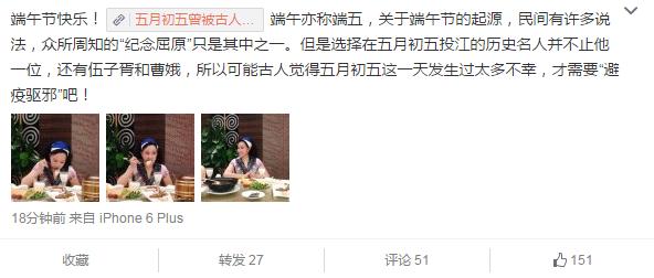 照片中,刘晓庆戴着发带,穿着深V领上衣,大口吃着粽子。刘晓庆还留言称:“端午节快乐!端午亦称端五,关于端午节的起源,民间有许多说法,众所周知的“纪念屈原”只是其中之一。但是选择在五月初五投江的历史名人并不止他一位,还有伍子胥和曹娥,所以可能古人觉得五月初五这一天发生过太多不幸,才需要“避疫驱邪”吧!”
