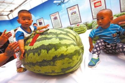 京华时报5月26日讯 25日,北京大兴区庞各庄镇,第27届北京大兴西瓜节全国西甜瓜擂台赛开赛,来自当地的瓜农李凤春在经历了前两届的失利后,最终以83.94公斤重的巨型西瓜将今年的瓜王桂冠捧回家。昨天上午的比赛现场,来自北京、天津、江苏等7个省市18个地区的335个“瓜选手”被一排排整齐地摆放在桌上,18人专家组和15名市民大众评审团对它们的外观、重量、含糖量等方面进行综合打分,最终评选出冠、亚、季军。(记者 翟烜 范继文 摄影报道)
