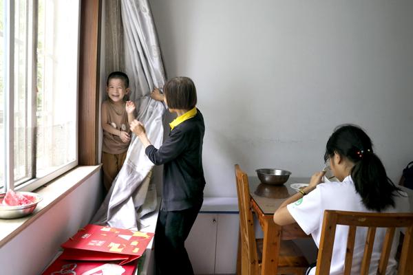 “小孙子黏我,累是累,不过很开心。”9月16日,66岁的严延香和4岁的孙子在玩捉迷藏,一旁读高中的孙女正抓紧吃饭,准备赶往学校读书。奶奶相告,爷爷不习惯城里的生活,一人住在乡下,虽不用种田了,但平日里喜欢出去打打零工干干活。