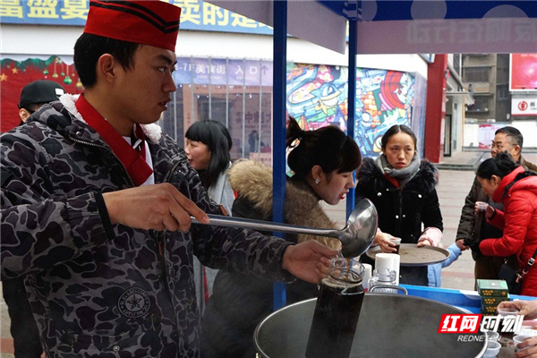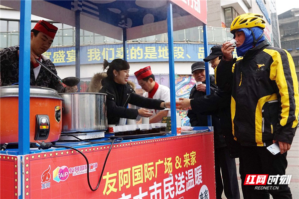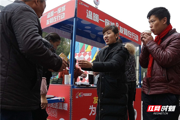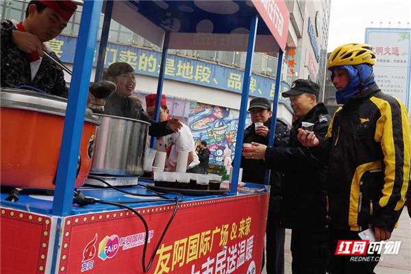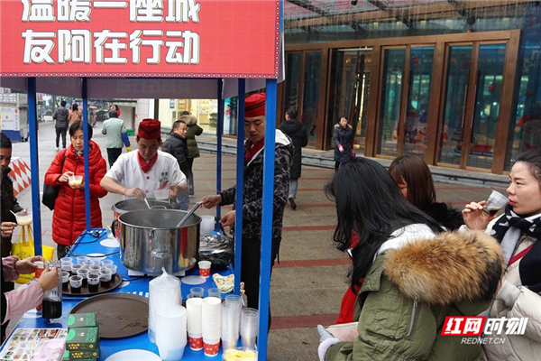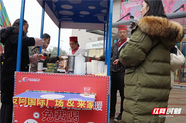 红网时刻12月14日讯 (通讯员 李加诺)“喝点甜酒冲鸡蛋、姜糖茶,暖暖身子!”12月14日,热情的友阿国际广场员工给过往的市民送去精心熬制的甜酒冲鸡蛋和姜糖茶,寒风冻雨中送温暖成了街头一道美丽的风景线。