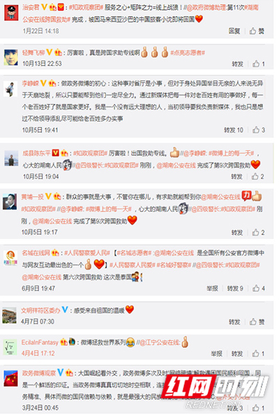 旅行时钱包被盗,钱有时不是最重要的,最重要的是护照。这条“跨国救助专线”还被网友写入了“出境游攻略”。也正因为“@湖南公安”的跨国处置事例在微博中广为流传,“线上战狼”的称号由此诞生,这也让出国旅游的人能够感受到哪怕身在异国,背后也有祖国的支持,倍感安心。曾有人对“跨国救助专线”如此评价:“一条微博让‘求’与‘助’的两端消除了一切管辖权异议,只留下最单纯的‘国民’和‘国家’间‘归’与‘属’的判断。”