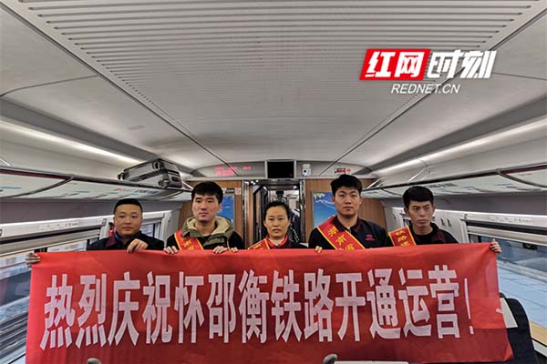 新乘务员们拉起横幅,迎接怀邵衡铁路的开通。
