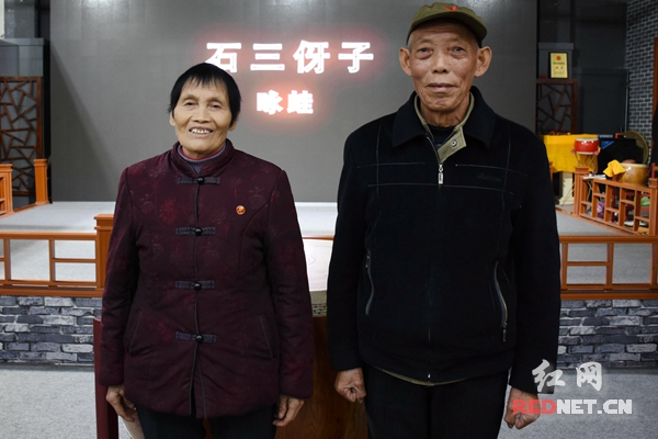 “郎在外面唱山歌,妹在房里织绫罗,我的哥诶!丢下绫罗我不织,丢下梭子我不梭,我一心收拾听山歌......”近日,记者走到韶山非物质文化遗产博览园,一曲纯正的韶山方言歌曲悠悠传来,记者闻声来到园内的非遗大舞台,只见台上站着一男一女,均已到古稀之年,他们用纯正、质朴的韶山方言,高声清唱情歌《韶山山歌》,没有伴奏,空旷质朴;没有修饰,原始而又率真,令人沉醉其中。站在台上的二位正是韶山山歌活态传承的代表性人物毛爱霞和毛继余,大家都亲切地称他们为“山歌王”。