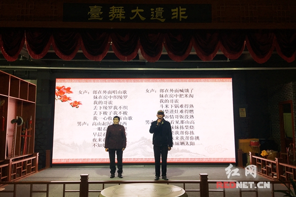 毛爱霞(左)和毛继余(右)在舞台上唱《韶山山歌》。