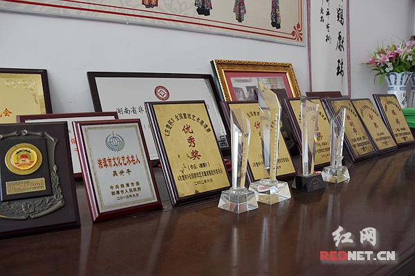 8月28日上午,红网湘潭站记者慕名来到湘潭升平轩纸影博物馆,见到了湖南省非物质文化遗产“纸影戏影偶制作技艺”代表性传承人,南派纸影及吴氏“异形刀法”传人吴升平。刚进吴老的家门,记者瞬间被满桌的荣誉称号和纸影的成品和半成品所吸引,走进房间里还发现了大幅剪纸和用包装纸折的各种人形挂件,客厅墙上挂满秦琴、胡琴等影戏伴奏乐器,可见吴升平老先生的心灵手巧,匠心独运。