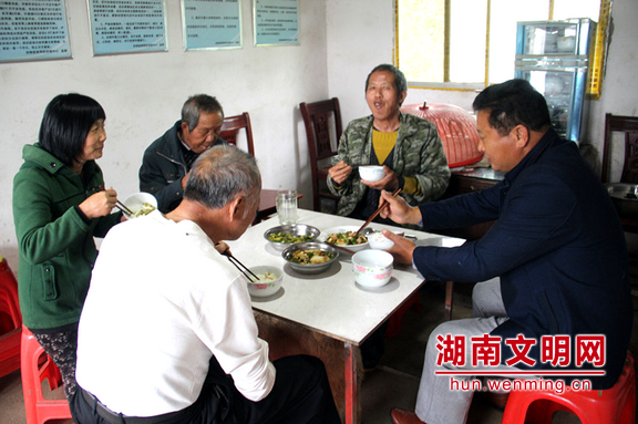 左彩元(右一)与残疾人一起用餐。图片来源:湖南文明网
