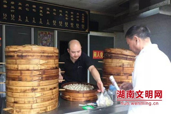 获评诚实守信“湖南好人”的吴鑫成是长沙“宏顺包子王”店铺老板。