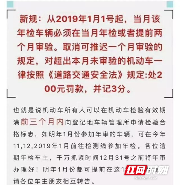 红网时刻1月2日讯(记者 潘锦 通讯员 杨哲)近日,有一则消息传遍朋友圈及各种微信群、QQ群:2019年1月1日当月年检车辆必须在当月年检或者提前两个月审验,取消可推迟一个月审验的规定,否则处200元罚款,并记3分。