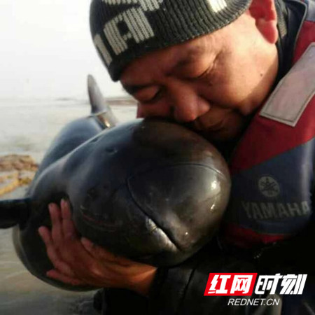东洞庭湖生态环境保护协会志愿者与“微笑天使”江豚的合影。