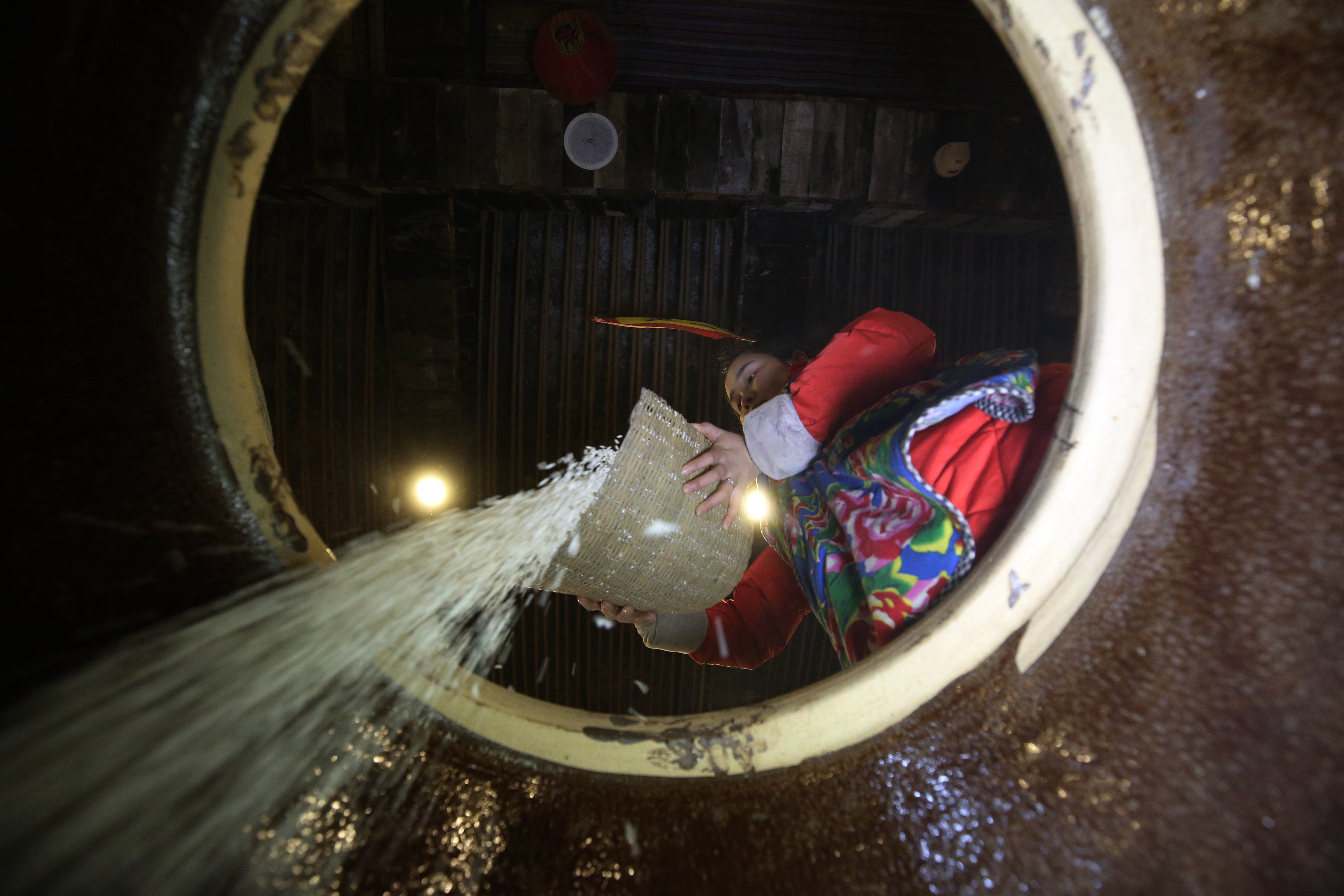 ↑1月8日,在湖南省张家界市武陵源区溪布老街酒坊,工人将酿酒用的糯米倒入缸中准备浸泡。