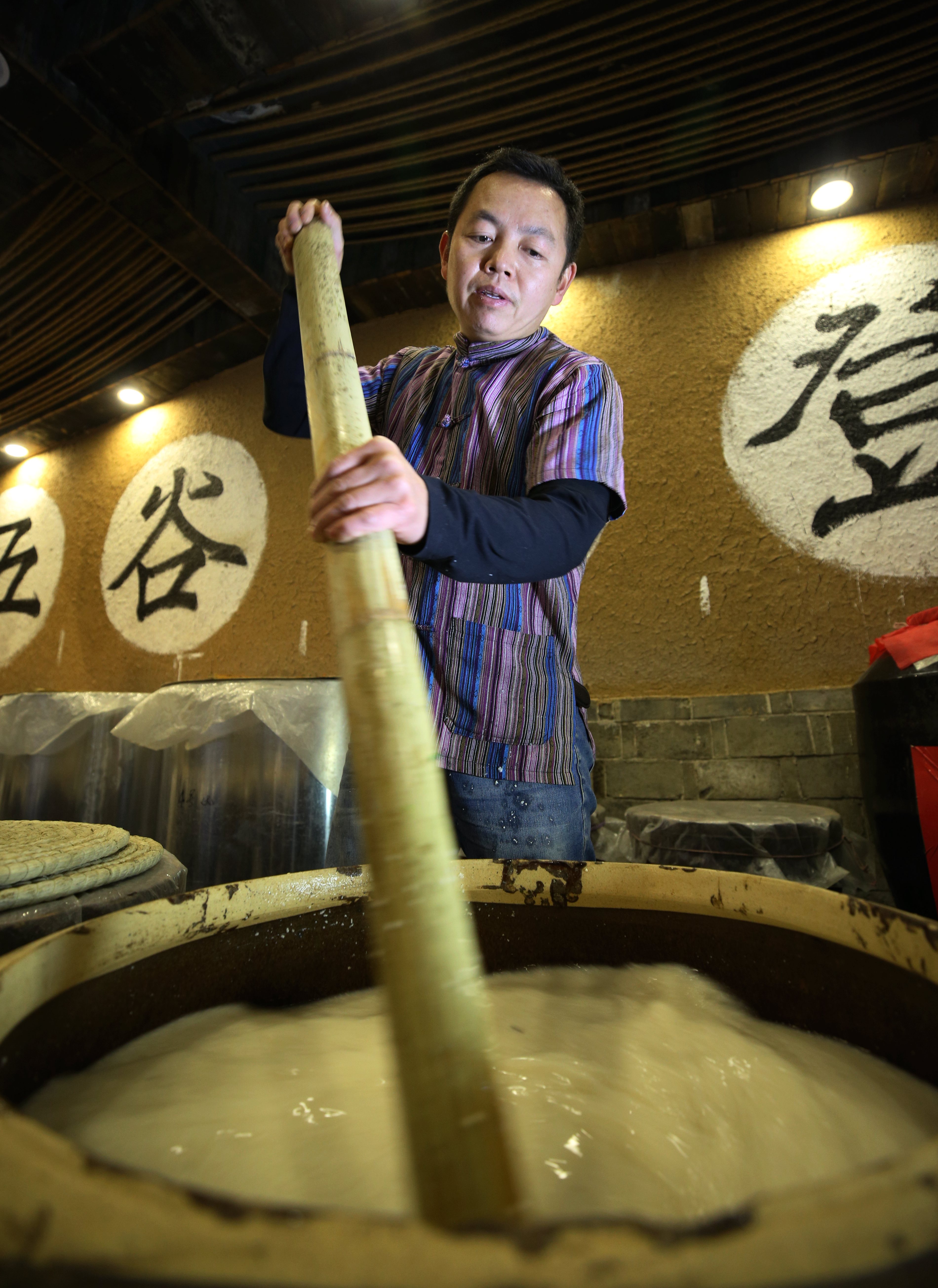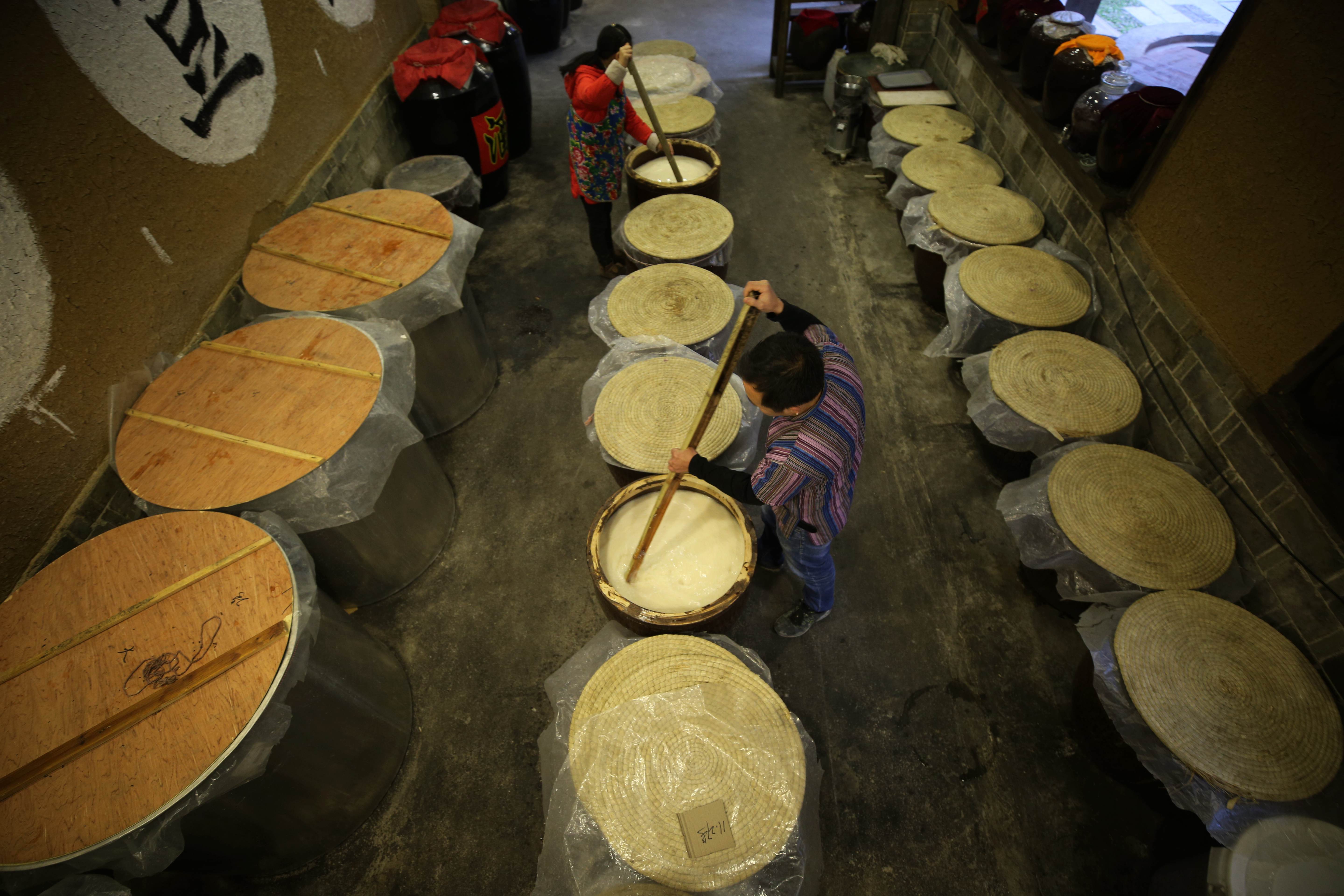 ↑1月8日,在湖南省张家界市武陵源区溪布老街酒坊,工人搅拌发酵的糯米。
