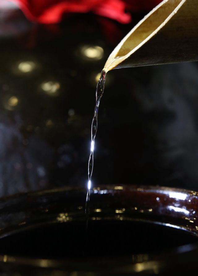 ↑1月8日,在湖南省张家界市武陵源区溪布老街酒坊,刚蒸馏出的糯米酒流入酒坛。