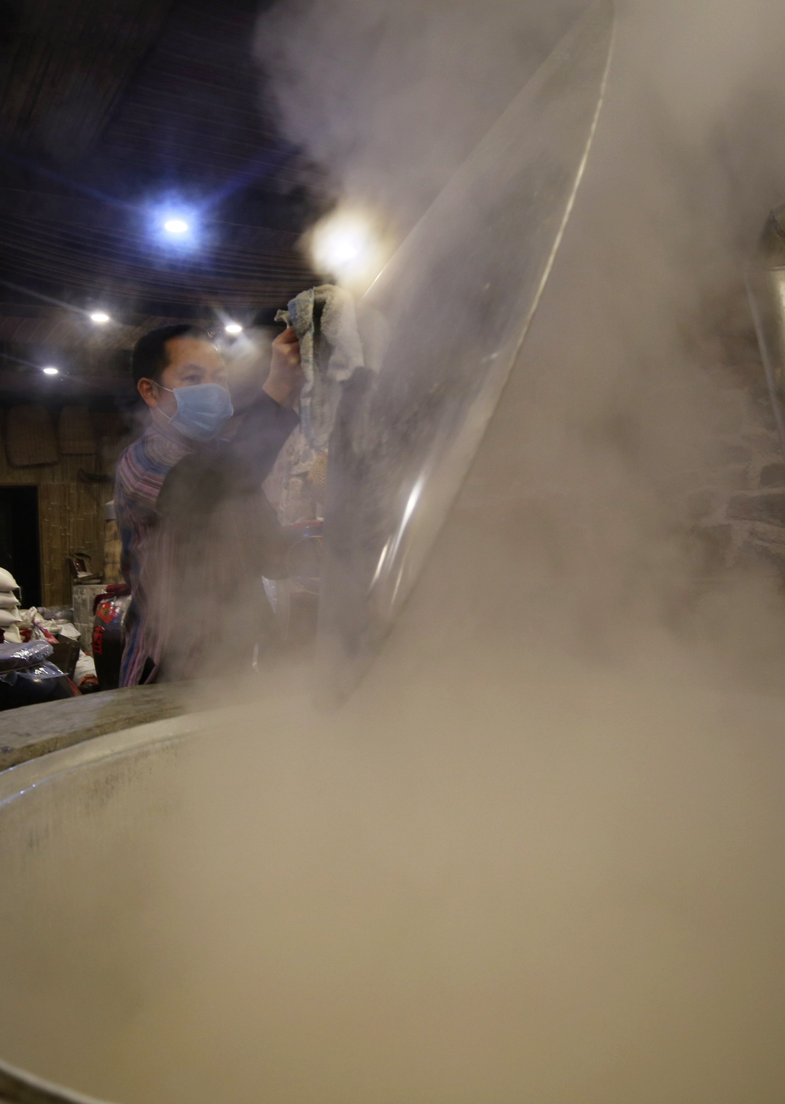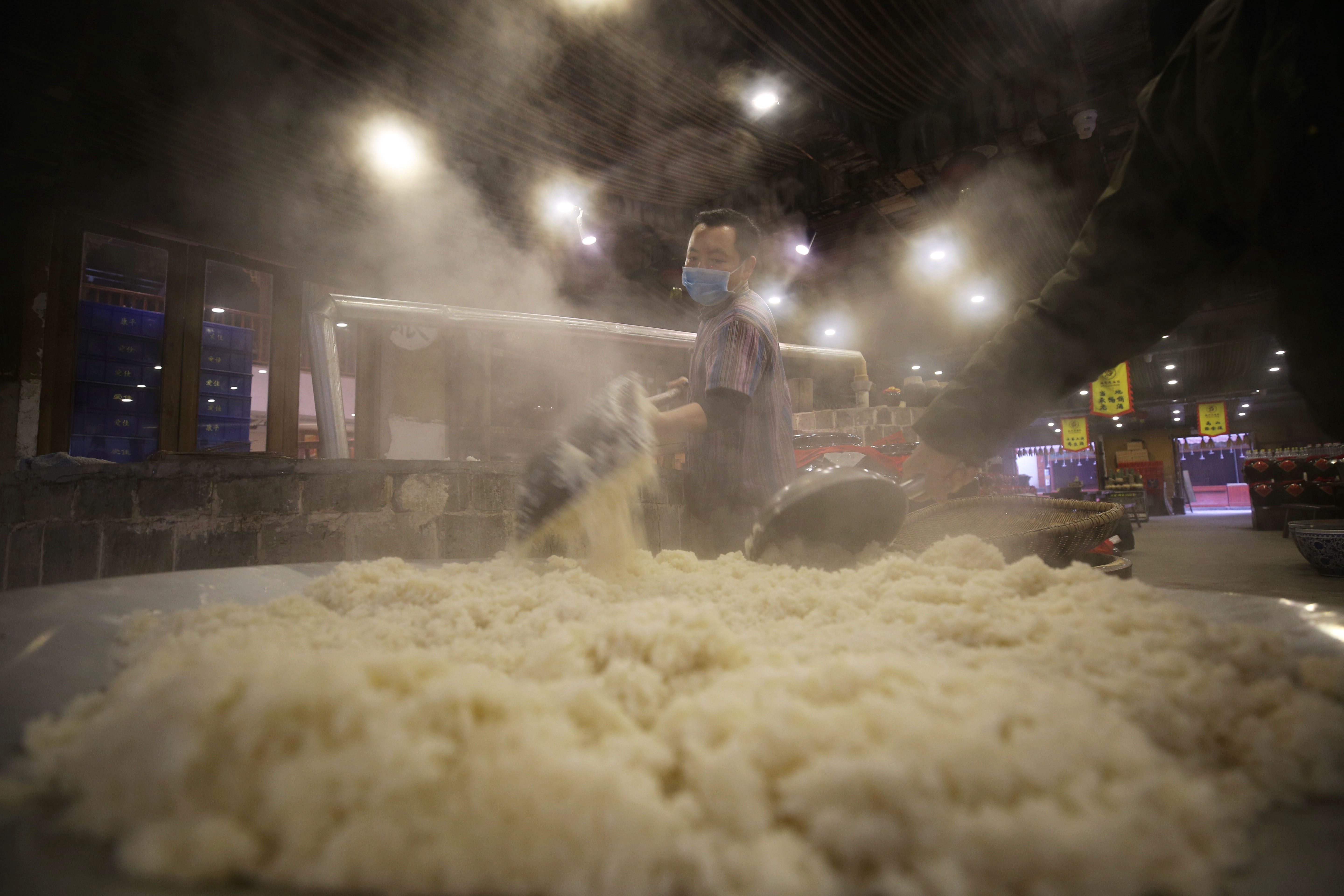 ↑1月8日,在湖南省张家界市武陵源区溪布老街酒坊,工人对浸泡好的糯米进行初蒸。