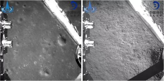 嫦娥四号动力下降过程中(左)和软着陆月背后(右)降落相机拍摄的月面。来源:中国航天科技集团、探月工程