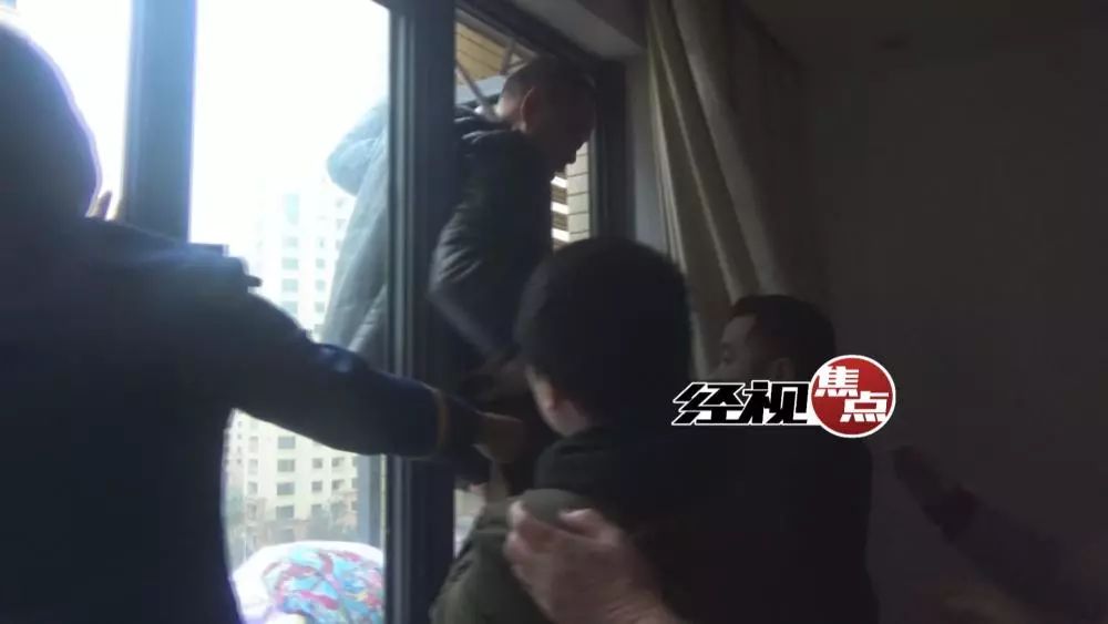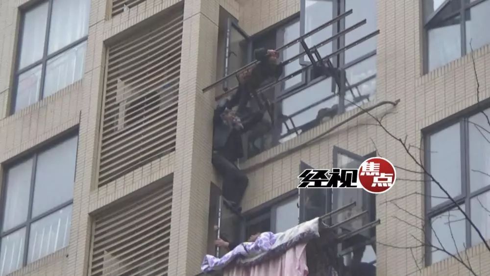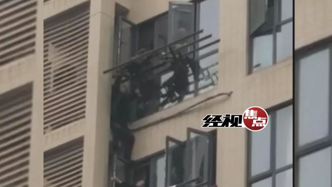 随后,消防队员又丢出安全绳,让丁光辉绑在身上,最终从7楼窗户跳入房内。