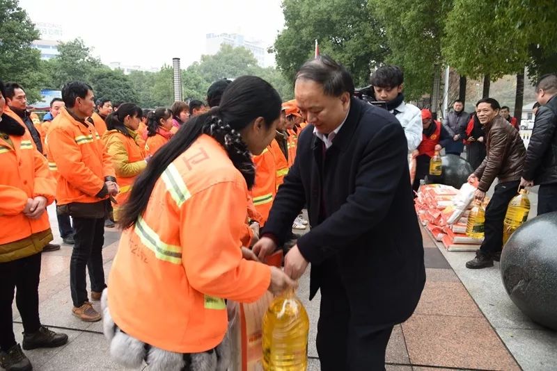 下午四点半,谭敦龙一行来到了岳屏广场,将米、油等年货物资分发给了在场30余名困难环卫工人。谭敦龙指出,各级党委、政府、工会组织深入一线慰问职工,是党中央特别是习总书记的殷切要求和深深牵挂。感谢全市环卫工人的辛勤付出,大家是城市环境的美容师,敬业奉献的践行者。市总工会将从一线环卫工人当中培育一批劳动模范,营造劳动光荣的社会风尚和精益求精的敬业风气。