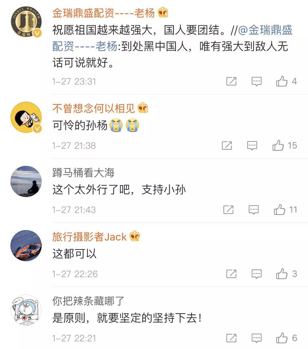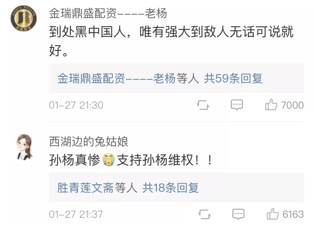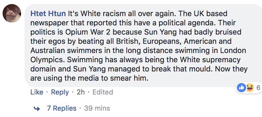 “又是白人种族歧视。英国报纸的报道都有政治目的,他们的政治目的就是发动第二次鸦片战争。因为孙杨在伦敦奥运会的长距离游泳比赛中战胜了英国,欧洲,美国和澳大利亚的选手。游泳项目一直都是白人的天下,孙杨试图打破这一模式。现在他们通过媒体来诽谤他。”