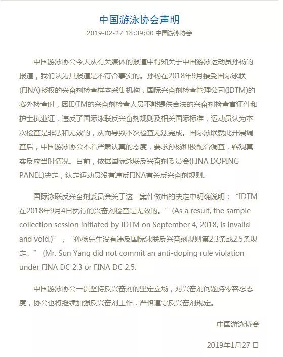 在这份声明的最后,泳协也引用了国际泳联反兴奋剂委员会关于这一案件做出的决定:“孙杨先生没有违反国际泳联反兴奋剂规则第2.3条或2.5条规定。”