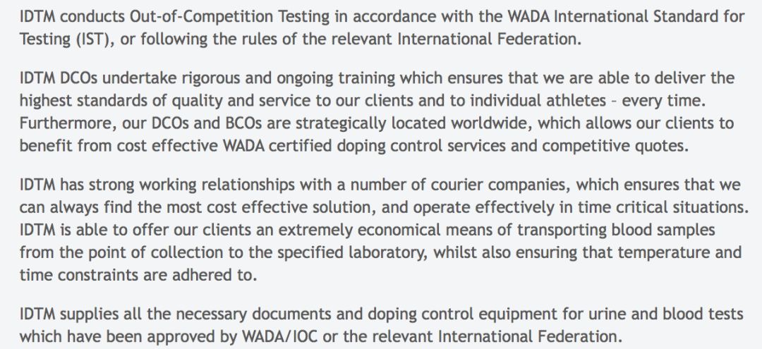IDTM声称,他们是独立于任何政治组织或国家外的中立机构,血液收集官都是经过认证的医生,护士和医务人员。在IDTM的网站上也明确写着:“进行飞行药检时,会严格遵守世界反兴奋剂组织的规定。”