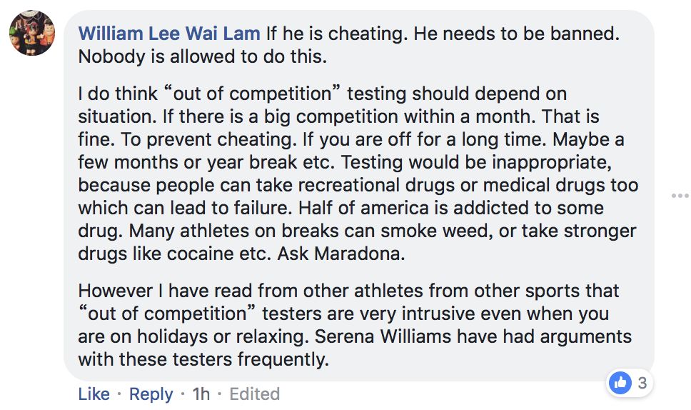 也有的网友对于“赛外兴奋剂检查“的合理性提出了质疑,并且认为这样的检查应该视情况而定。